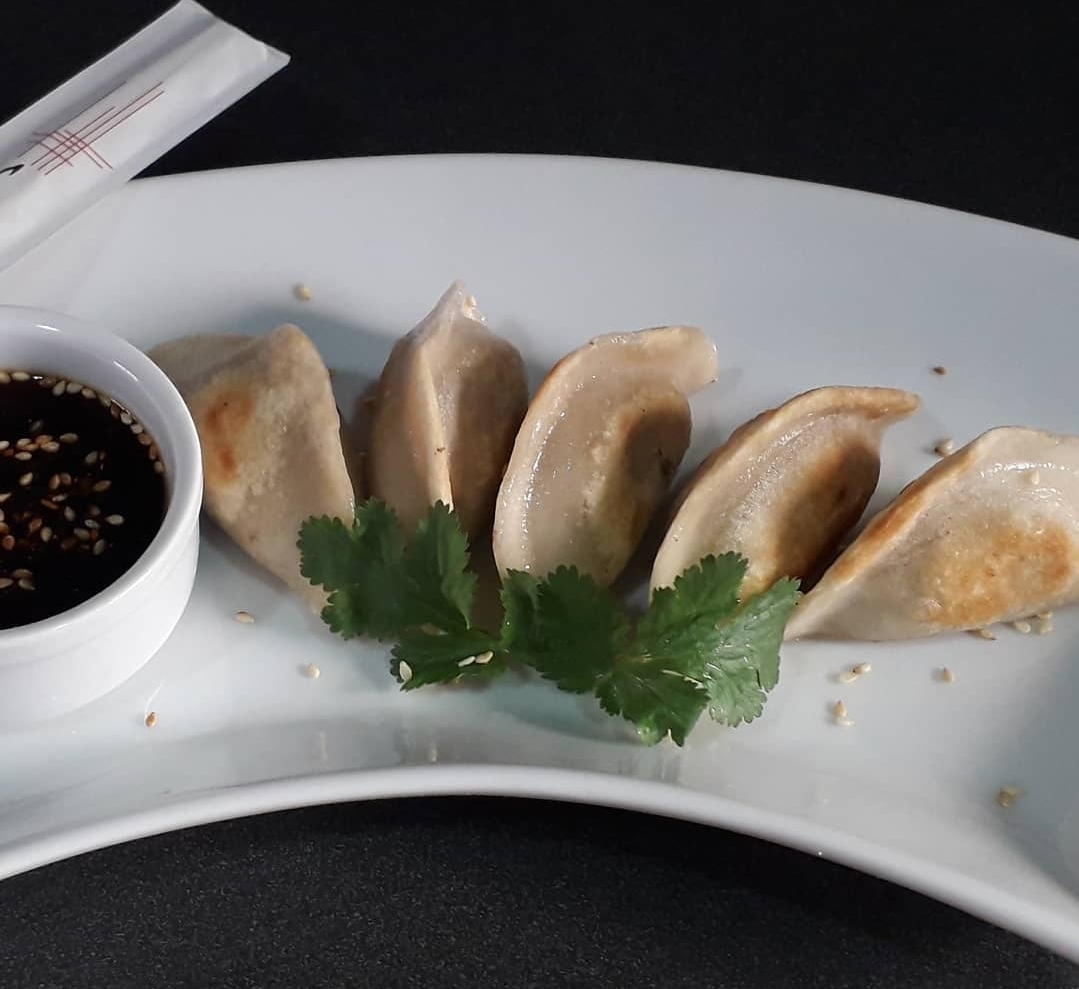 Cinco empanadas Japonesas rellenas de pollo mas salsa ponzu.