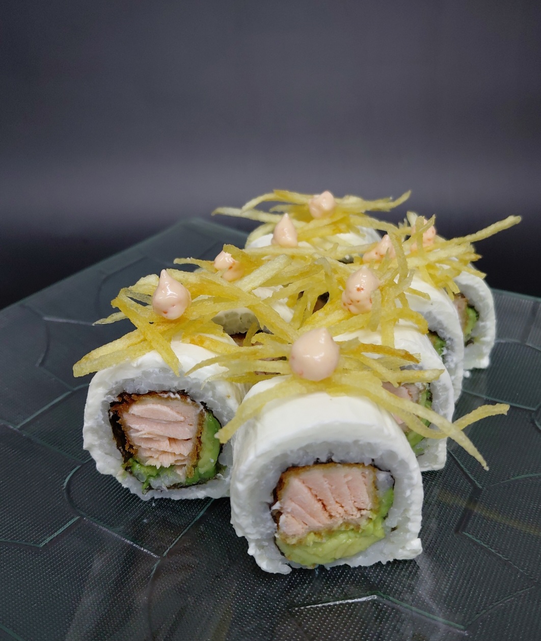 Salmón apanado, palta, cebollin envuelto en queso crema con papas hilo y salsa spicy.