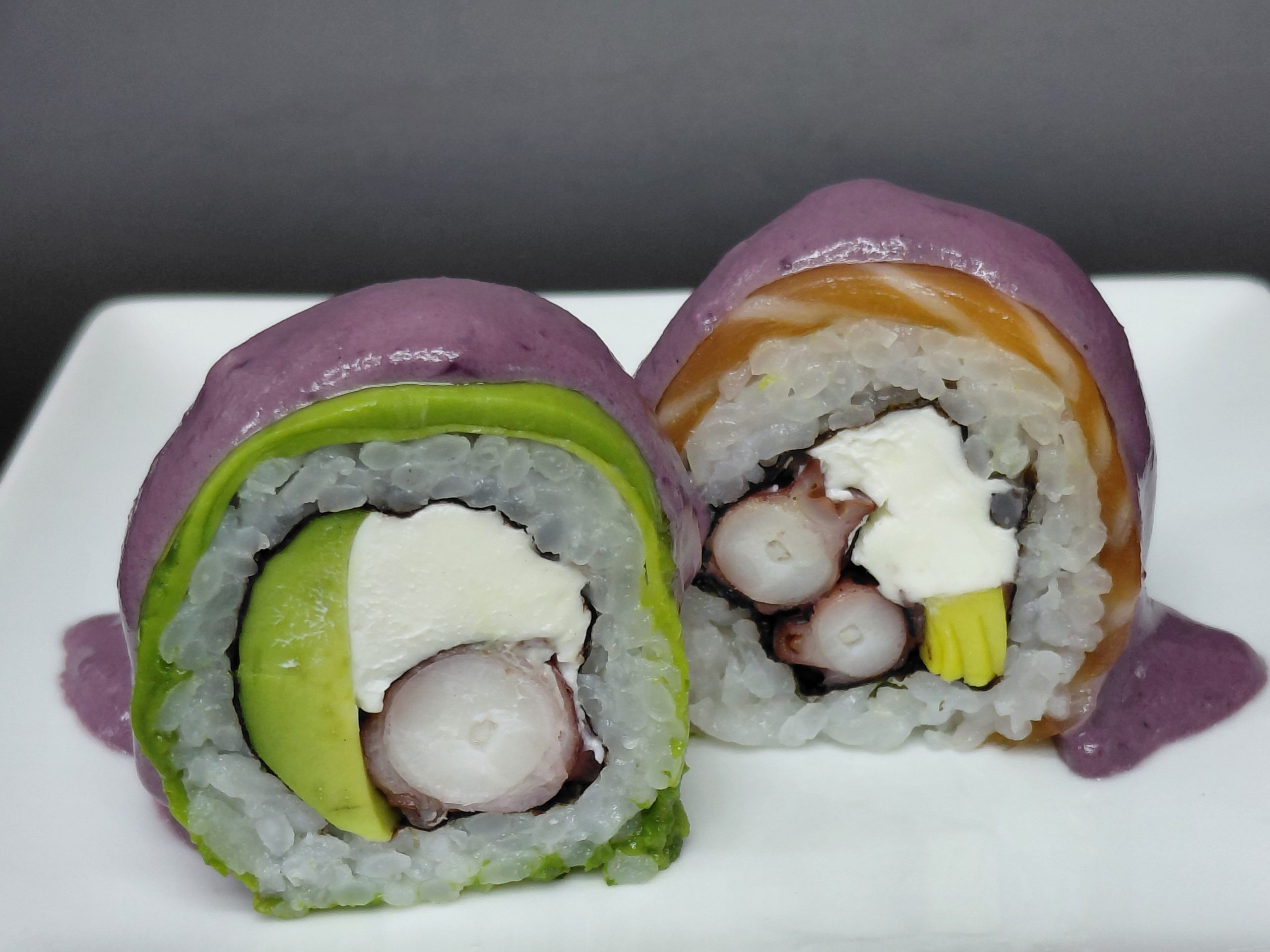 Pulpo, queso crema y palta envuelto en arcoiris de palta y salmón con salsa al olivo.