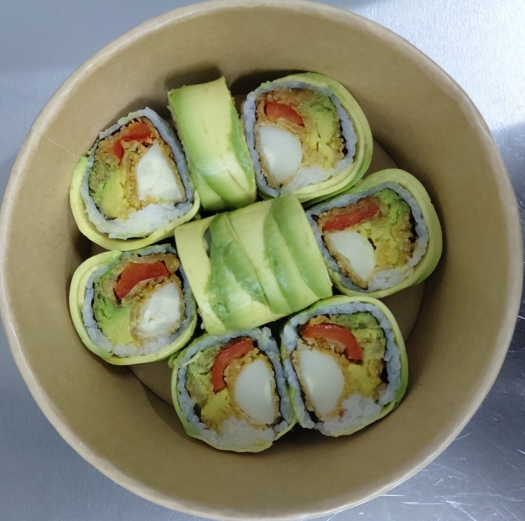 Palmito tempura, pimenton tempura, palta tempura envuelto en Palta.